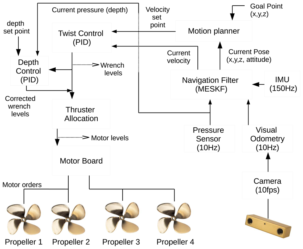 The navigation functions include the MESKF for sensor fusion and pose estimation and all of the modules for twist and depth control, and it is detailed in Section 4.