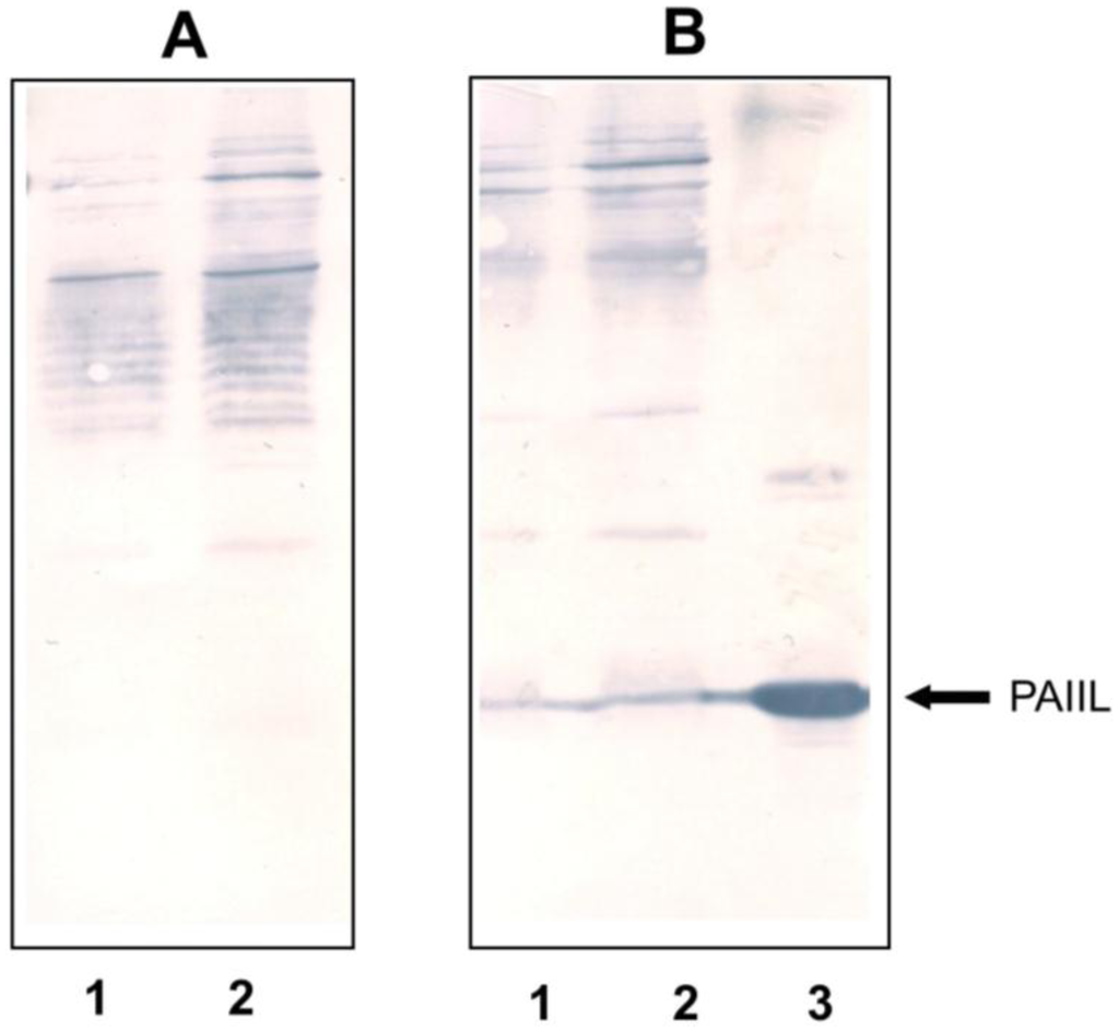In order to develop a tool for PA prophylaxis preventing bacteria adherence to CF airway epithelial cells, we prepared chicken yolk antibodies against PAIIL. This bacterial lectin is assumed to enhance the PA binding to CF cell glycoconjugates with impaired sialylation [11,15]. ELISA of IgY fractions of yolks confirmed that specific anti-PAIIL IgY was effectively produced in the course of the immunization procedure (not shown). Anti-PAIIL IgYs were further examined on Western blots to prove their binding activity with PAIIL in bacteria lysates. As shown in Figure 1, anti-PAIIL IgY recognized PAIIL both in recombinant sample and in PA lysate. Blots developed with pre-immune IgY showed no reactivity with PAIIL (panel A), thus they served in further experiments as a control IgY. The cultivation of PA in mineral medium “M9” [16] did not significantly induce the production of PAIIL as compared with common medium PS (see Figure 1). This discrepancy might be attributed to the variability of PA strains, as PA used in our experiments was a clinical isolate ST1763 but not a strain 1244-NP.