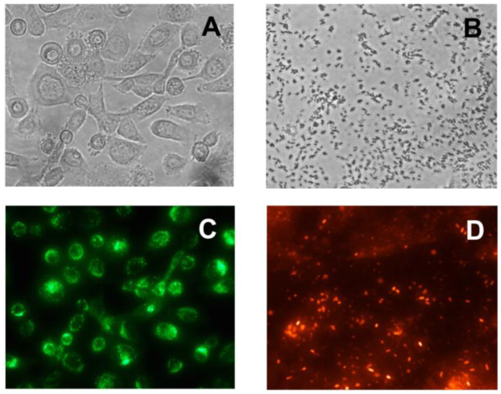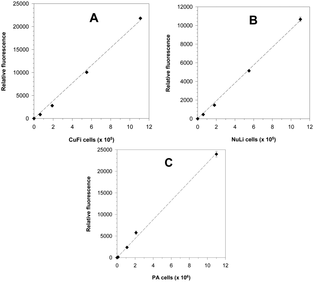 To evaluate anti-PAIIL IgY as a potential tool for PA prophylaxis of CF patients, an ex vivo bacterial adhesion assay was developed. The experimental set-up is based on the use of airway epithelium cells adhered on well plates, which were exposed to PA in the presence or absence of anti-PAIIL IgY. The epithelial cell line derived from CF-patient lung tissues (CuFi) was employed to mimic conditions of CF subjects. Cells from airways of a healthy donor (NuLi) were included in the assay for comparison. The precise quantification of adhered PA on epithelial cell monolayer was made possible by labeling the bacteria and epithelial cells with fluorescent dyes. Lipophilic cell tracking PKH dyes are well suited for the assay design as they do not affect cell surface structures important for PA adhesion, show a low impact on the cell viability, and allow a long-term monitoring of cells in vivo. Moreover, the fluorescence of PKH26 can be measured without interference with PKH67 dye that is essential for the assay set-up when both cells are simultaneously present in the well. Figure 2 represents micrographs of PA and epithelial cells stained with red fluorescent PKH26 and green fluorescent PKH67 dyes, respectively. Stained CuFi, NuLi and PA cells showed a linear relationship between the number of cells and their relative fluorescence (see Figure 3) which makes the cell quantification possible.