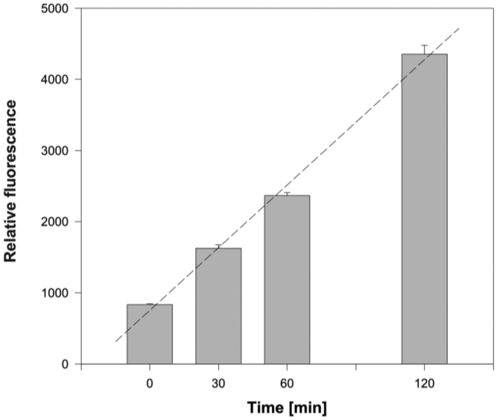 In pilot experiments the length of PA incubation with monolayers of epithelial cells was examined. After the removal of non-adherent bacteria and extensive washing of wells, the number of P. aeruginosa associated with epithelial cells was determined. Under the input ratio of about 30 bacteria per epithelial cell the number of bound PA cells increased almost linearly with time during the course of incubation (see Figure 4). The PA adhesion seems to be rather fast as even the momentary exposure of epithelial cells to PA followed by their immediate removal (time 0 in Figure 4) resulted in detectable amounts of retained PA. To gain a readout of relative fluorescence high enough for precise quantification of adhered PA, the 2-h incubation was chosen for further adhesion experiments. These conditions were used to test the efficacy of anti-PAIIL IgY in the PA adhesion assay with both cell lines. Results are expressed as relative fluorescences of PA normalized per number of NuLi/CuFi cells. This arrangement eliminates possible variations caused by differences in the number of cells in monolayers.