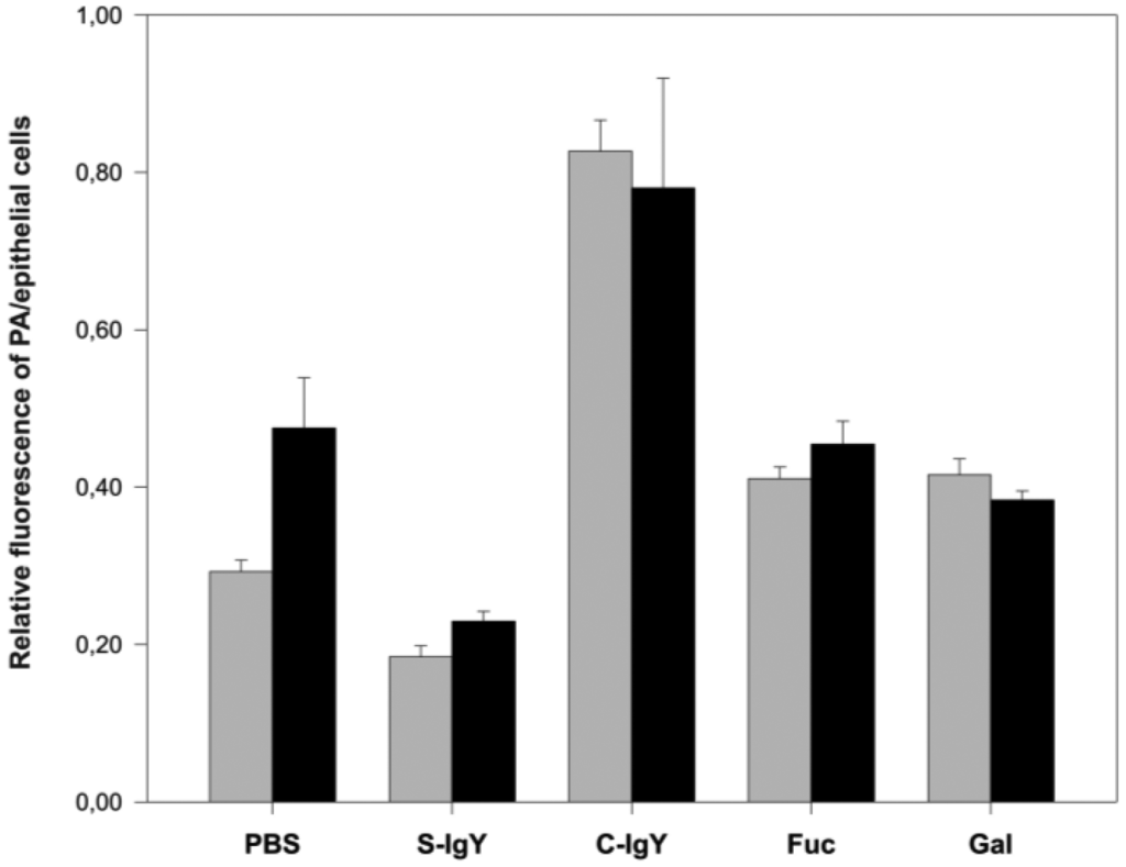 The new cellular assay system based on dual fluorescence determination was developed and used to study P. aeruginosa adherence inhibition. Herein we report for the first time that chicken yolk antibodies developed against PAIIL are effective in reducing bacteria adhesion on human airway epithelia cells. Our results suggest that the anti-PAIIL IgY may provide an alternative therapeutical approach in prevention of P. aeruginosa infections. The proven anti-PAIIL efficacy of IgYs allows us to extend our research further and examine prophylactic properties of these antibody on animals experimentally infected with PA.