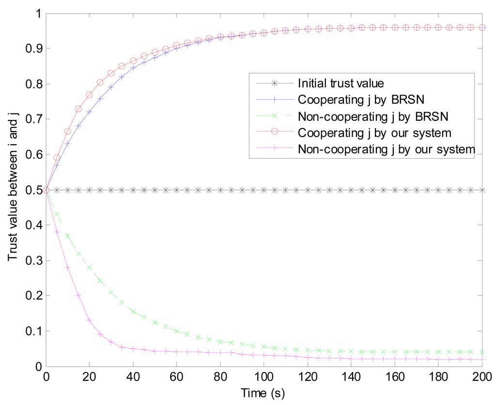 As shown in Figure 10, the trust value for a credible sensor node increases monotonously to an upper limit. On the contrary, a compromised sensor node's trust value decreases monotonously to a lower limit. We also compare the performance of our reputation and trust system against BRSN in the aspect of convergence time. In initial stage, the trust value of j in i is set to be 0.5 because sensor node i can't detect whether j is credible or not. The trust value updates and becomes stable as time goes on. If j is credible and cooperates with i, the trust value becomes stable in about 100 s and our system's convergence time is shorter. If j is a compromised sensor nodes, its trust value becomes stable in about 100 s by BRSN. However, in our reputation and trust system, the convergence time is about 35 s which is much less than 100 s. Simulation illustrates that our reputation and trust system performs much better than BRSN in convergence time especially for a compromised sensor node.