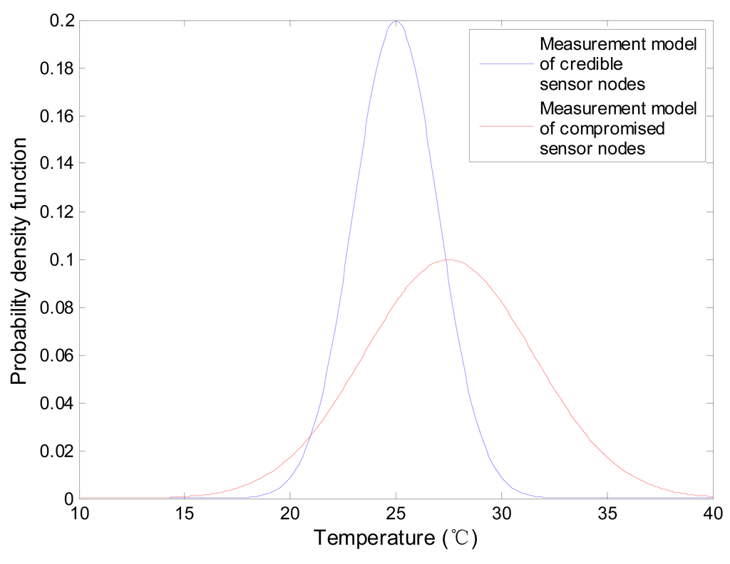 This section investigates the accuracy of DCHM-based data fusion algorithm. The comparisons between data fusion algorithm without DCHM and using DCHM are presented. As discussed previously, the measurement models of sensor nodes are Gaussian distributions and they are shown in Figure 11. The mean values of the two measurement models are 25 and 27.5, respectively. Obviously, the compromised sensor nodes can significantly mislead the data fusion results.