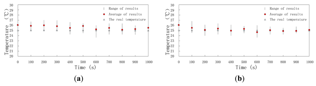 Data fusion results are affected by time and the ratio of compromised sensor nodes. On one hand, when ratio is a constant value, data fusion results change with time, because the reputation and trust system updates as time goes on; on the other hand, at a constant time, data fusion results are different because of different ratios and the higher the ratio is, the worse the data fusion result is. First, we set ratioto 30% and research the change of data fusion results with time. Though the real temperature and humidity are assumed to be stable all the time, the data fusion results change as time goes on as shown in Figures 12 and 13. When the clusters don't employ DCHM as shown in Figures 12a and 13a, the data fusion results are always higher than the real value. Without DCHM, the errors of data fusion results, i.e., the distances between the squares and triangles are random. This phenomenon illustrates that the data fusion results are misled by the compromised sensor nodes and as a result, the users of WSNs are also misled. On the contrary, when the clusters employ DCHM, the data fusion results are much better as shown in Figures 12b and 13b. In the initial stage, data fusion results are higher than the real value, because the misleading effects of compromised sensor nodes. However, as time goes on, data fusion results becomes close to the real value and about 400 s later, data fusion results are stable and the error is very little.