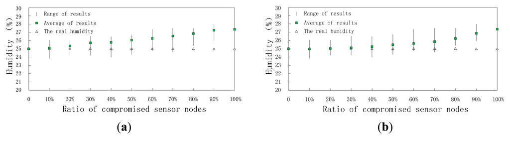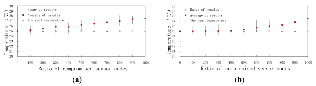 We also research how the rations of compromised sensor nodes affect the data fusion error. In this experiment, we set time to the 300-th second and ratio ranges from 0% to 100% with intervals of 10%. The results are shown in Figures 14 and 15.