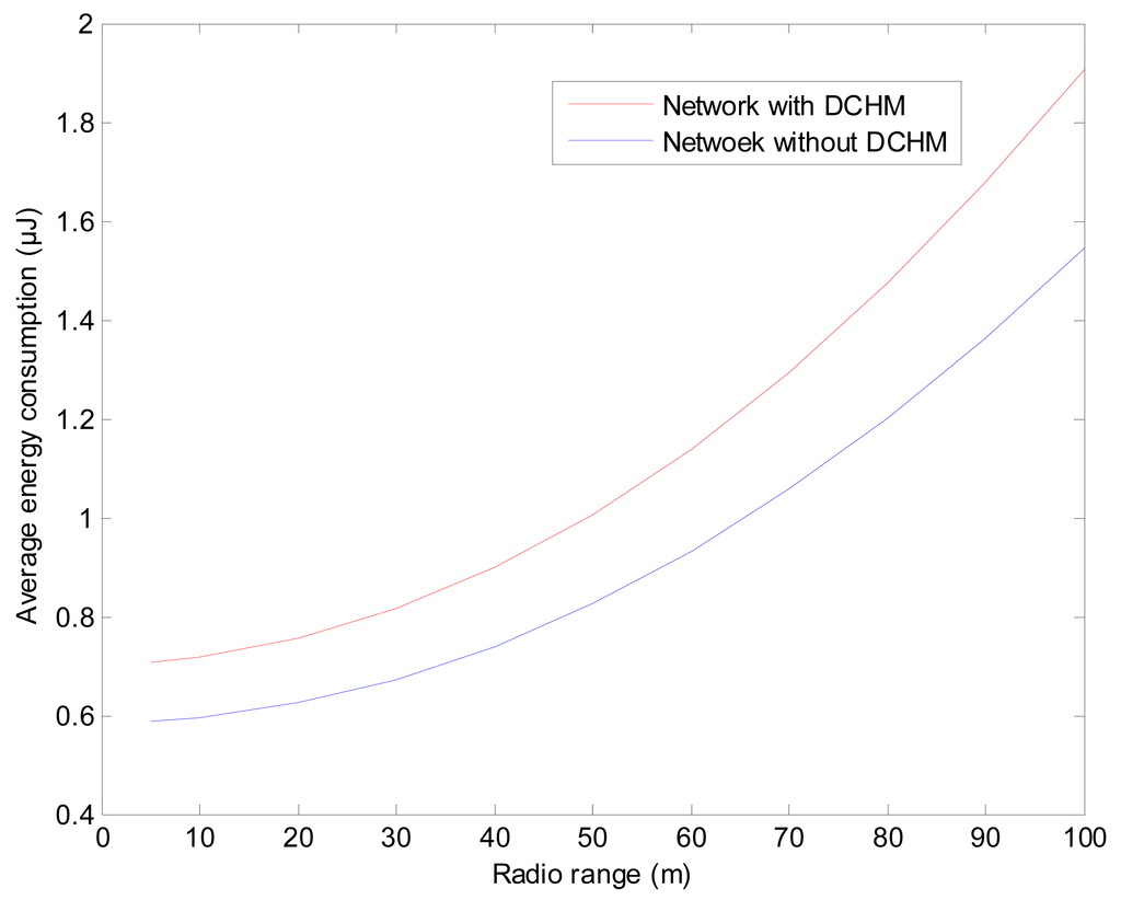 The average energy consumption measures the ratioof total dissipated energy of the whole network in a second to the number of all the sensor nodes. As declared in Section 5.1, DCHM updates once every five seconds. We first give the simulation result of the average energy consumption over the radio range of the sensor nodes and then present the lifetime of the networks with and without DCHM, respectively.