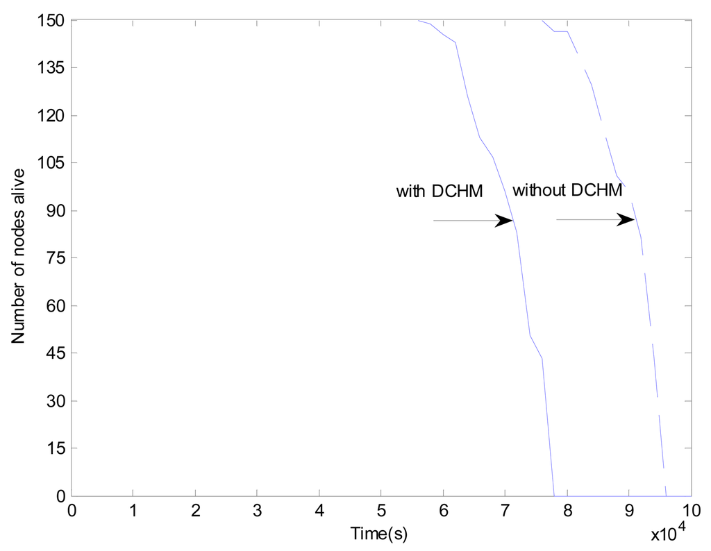 Figure 17 shows the number of nodes alive over time in the networks with and without DCHM, respectively, when the radio range is 50 m. We can find that in the first 5.5 × 104 s, most of the nodes are alive in both networks. However, the number of the sensor nodes alive in the network with DCHM begins to decrease significantly after 5.5 × 104 s and that in the network without DCHM begins to decrease significantly after 7.5 × 104 s. The nodes in the network without DCHM remain alive for a longer time, because a smaller amount of data has been processed in the network without DCHM. In conclusion, the DCHM is a tradeoff between security and energy efficiency of the networks.