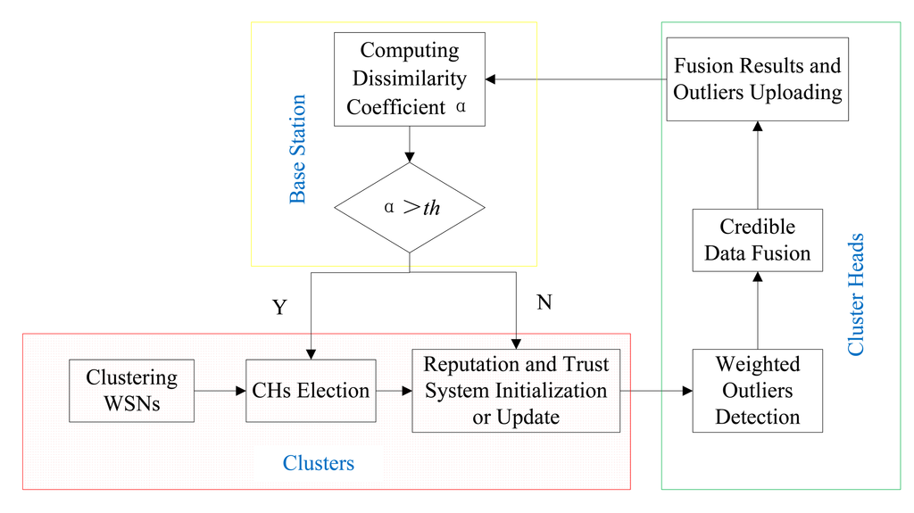 As shown in Figure 3, the whole framework of DCHM is composed of three modules, i.e., Cluster Module, Cluster Heads Module and Based Station Module. Cluster Module includes three sub-modules, i.e., clustering WSNs, Cluster Heads Election, Reputation and Trust System Construction or Update. Cluster Heads Election also includes three sub-modules, i.e., Weighted Outliers Detection, Credible Data Fusion, Fusion Results and Outliers Uploading. The function of base station part is judging the security of the cluster heads based on the uploading information. There is a feedback from base station part to cluster part and the feedback makes contributions to improve the security of the cluster heads and accelerating the convergence of the reputation and trust systems.