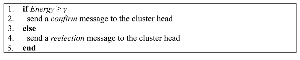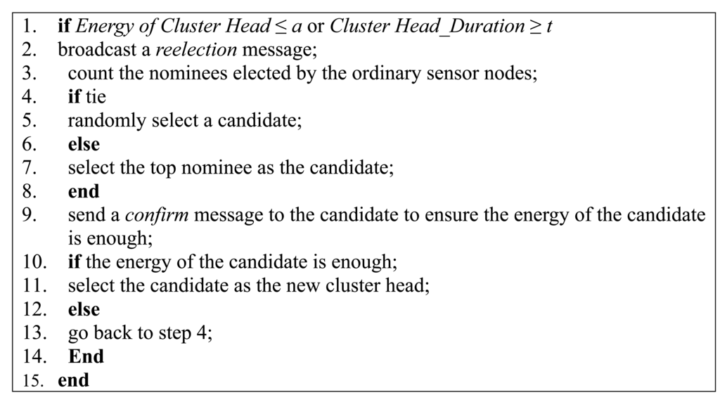 The cluster head first broadcasts a reelection message in a cluster. Then, all the sensor nodes in the cluster vote for a new cluster and two candidates are uploaded by each sensor node. The current cluster head tallies the votes and decides the winner based on majority rule. After a sensor node being selected as a candidate, a confirm message is sent to the sensor node to ensure that the energy of the candidate is enough. However, if the energy of the candidate is not enough, the current cluster head need to select a new candidate until a candidate with enough energy is selected and this candidate is the new cluster head.