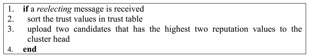 After receiving the reelection message, the ordinary sensor nodes vote for a candidate. Each sensor node needs to sort the trust values in its trust table and vote for two neighbors that have the highest two trust values. The voting message needs to be encrypted with the cluster key.