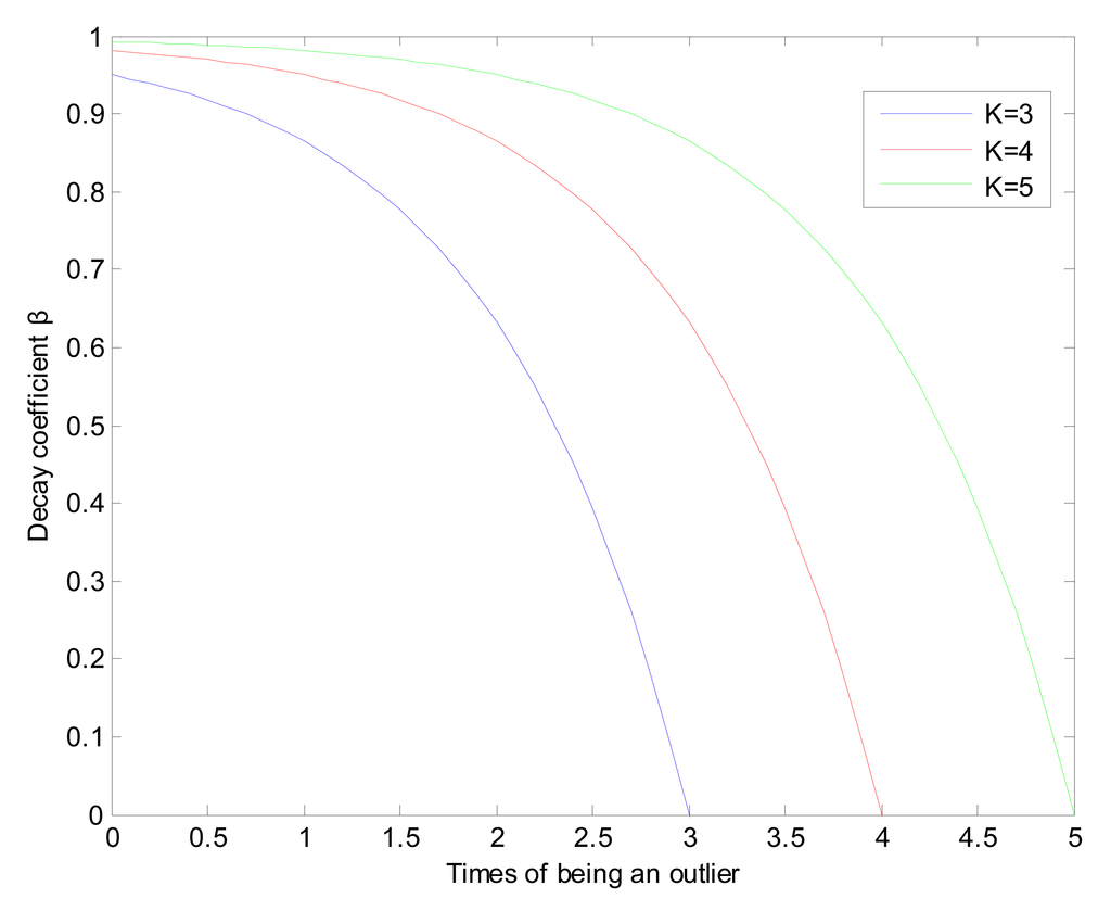 If α ≤ th, which means that both the cluster heads are credible, only the reputation and trust system should be updated. The base station sends the list of |L1∩L2| to the cluster and each of the sensor nodes in the cluster needs to check whether its trust table contains the outliers or not. If a outlier is contained in the trust table, the trust of the outlier decreases to Tru*β, where 0 ≤ β < 1. In this paper, β is defined as follows: