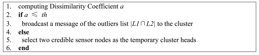 If the original cluster heads are credible, an outlier list is sent to the cluster and each sensor node needs to compare the list with its own trust table and the outliers' trust value Tru decreases by a parameter β which will be discussed in Section 4.4 in detail.