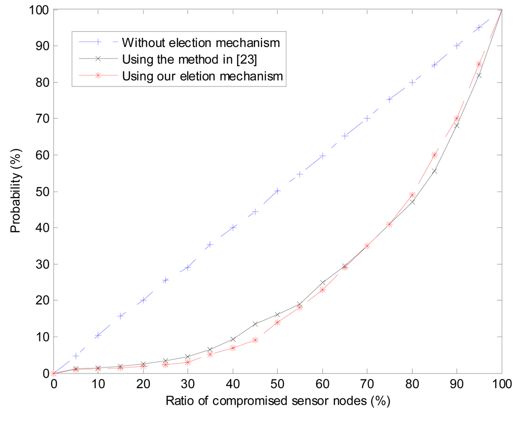 In our simulation, the time that a compromised sensor node csni acts as a cluster head is denoted by ti and the probability of selecting compromised sensor nodes as cluster heads is defined as follows: