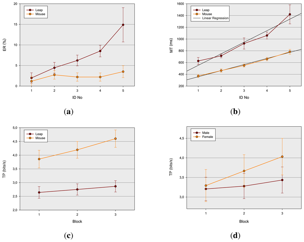 Data analysis was based on a 2 (device) × 2 (gender) × 5 (ID) × 3 (block) mixed design. The design consisted of the between-group factor gender and the within-group factors device (mouse vs. LMC), index of difficulty (ID ∈ {1, 1.6, 2.3, 3.2, 4.1}) and block (1, 2, 3;. With regard to the factor device, participants performed in the mouse condition pointing movements using a mouse in the conventional manner and selecting the target by a click of the left mouse button. In the LMC condition, participants used their index finger to interact with the LMC device (cf. Figure 2b). In the LMC condition, participants had to perform aiming movements between the targets and select the respective destination targets by an additional pointing movement (tap gesture). The different ID conditions were combinations of varying distances and target widths (see Table 1). To assess training and learning effects, each combination of the factors device and the index of difficulty was performed in each of the three consecutive blocks. Each participant received a different order of the factors target widths, target height and device, based on a Latin square. For each of the conditions, 20 selections were performed. To measure and compare the performance of the two devices, three dependent variables were used: movement time (MT in ms), error rate (ER in %) and throughput (TP in bps). MT was the mean time per trial, including both the time to move from the source target to the respective destination target and the time to make a selection. The error rate was the percentage of out-of-target selections. TP was calculated according to Equation (3) (cf. Section 2.1).