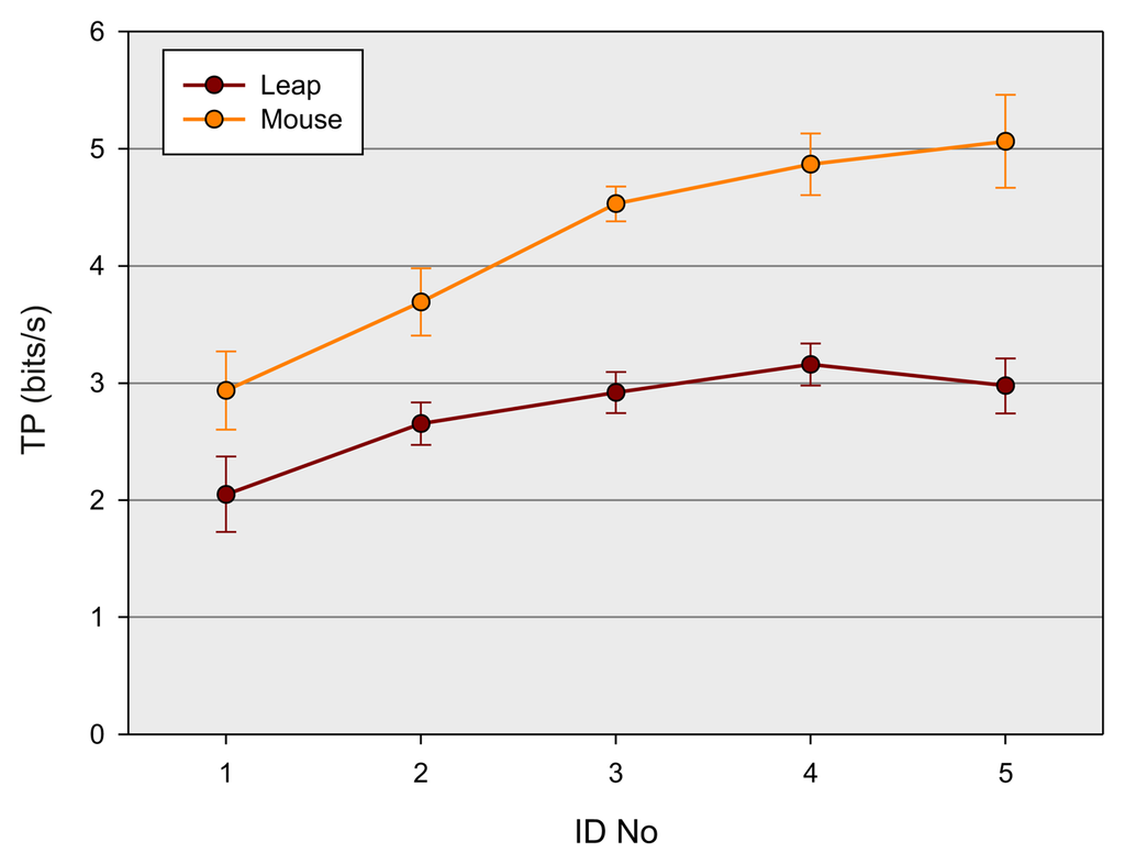 As already mentioned earlier in this paper, throughput (TP) is an additional important measure of performance, combining both speed and accuracy, and is considered as the main indicator to estimate or predict the performance of users with a certain device. To assess TP for the two devices, a three-way ANOVA with the factors gender, block and device was conducted. Mean TP over the entire experiment was 3.5 bps. There was a main effect of block, F(2, 20) = 21.0, p < 0.001, , of device, F(1, 10) = 124.0, p < 0.001, , but not of gender, p > 0.2. The main effect of block indicates that the throughput generally increases significantly with the number of blocks (3.3, 3.5, 3.7 bps). In agreement with the findings for the error rate and the movement time, there was a lower throughput for the LMC than for the mouse movements (2.7 vs. 4.2 bps). This main effect was modulated by the factor block, viz. there was a steeper growth for the mouse than for the LMC, F(2, 20) = 4.7, p = 0.04, with increasing number of blocks (cf. Figure 4c). Post hoc analyses (Duncan's test []) revealed that the TP of both devices differed significantly at each level of block (p < 0.001). Subsequent tests between each block level within each of the two devices showed that TP for the mouse significantly differed between each level of block (p < 0.01), which indicates a continuous increase of practice. There were, however, no significant differences for the LMC device between the three levels of block (p > 0.09), which suggests that there was no significant practice effect at all. There was also a significant interaction of the factor block and gender F(2, 20) = 5.9, p < 0.01, (cf. Figure 4d). Post hoc tests revealed that TP for female participants differed between each level of block (p < 0.003), but not for male participants (p ≥ 0.06). However, pairwise comparison between the two groups at each level of block failed to reach significance (p ≥ 0.10), presumably due to the lack of statistical power of this between-subject comparison. The result, however, gives at least a hint that there was a practice effect for female, but not for male participants. The main effect of block suggests that training provokes a general increase of throughput, independently of the device used. This finding corroborates the general practice effect found for MT. In contrast to the earlier studies of Rohr [], which found lower performance in pointing movements for female than for male participants, no gender-specific training effects on MT, but on TP, are found. The TP of female participants seem to gain more from practice than the TP of male participants. No other effects attained significance within the three-way ANOVA (p > 0.062). To estimate the maximal possible throughput of the two devices, which could be reached within the range of provided IDs, an additional two-way ANOVA with the factors device and ID was calculated. There was a main effect of ID-No, F(4, 40) = 18.1, p < 0.001, . As depicted in Figure 5, the throughput of both devices increased differently, F(4, 40) = 11.1, p < 0.001, . Post hoc tests between the two devices revealed that there is a significant difference in TP for each level of ID (p < 0.001). Further post hoc comparisons between ID levels within each device suggest that TP for the mouse device differs significantly (p < 0.03) between each ID level up to the fourth level. There was no significant difference between ID Levels 4 and 5 (p = 0.19). For the LMC devise, however, there were subsequent significant differences only between ID Levels 1 and 2 (p < 0.001) and Level 2 and 4 (p < 0.003). There seems to be a drop in TP between ID Levels 4 and 5, which, however, does not attain statistical significance (p = 0.23). The results of the post hoc analyses suggest that there is a continuous increase of TP for the mouse device, and saturation is reached at ID = 3.2 at a maximal TP = 5.0 bps (averaged over ID Levels 4 and 5). In the LMC device, the increase of TP seems to be rather inconsistent in comparison with the mouse device. However, analogous to the mouse device, saturation for TP seems also to be reached at ID = 3.2 with an average maximum TP = 3.1 bps. The findings suggest that the throughput of the LMC device is similarly affected by ID, like the mouse device, but at a lower level.