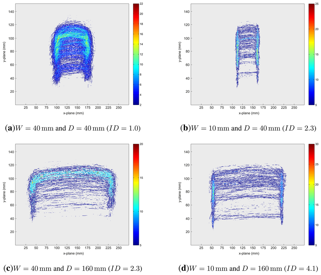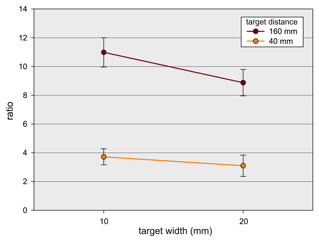 Different patterns of movement trajectories dependent on different target width/distance conditions for the LMC were observed. Figure 6 depicts accumulator plots of the movement trajectories for LMC conditions with ID = 1.0 (Figure 6a), ID = 2.3 (Figure 6b,c) and ID = 4.1 (Figure 6d). Trajectory space is discretized in the x-y-plane into accumulator cells, and the complete set of trajectories is mapped spatially to these cells. Each cell's value is defined by counting the intersections of movement trajectories with these cells. Afterwards, accumulator values are visualized as a heat map. It can be observed that the conditions under which the pointing gestures are performed have a high impact on the movement trajectories. Relatively large target widths result in arc-shaped trajectories (cf. Figure 6a,c), while this effect decreases with decreasing target widths (cf. Figure 6b,d). This suggests that for large target widths, the pointing gesture was incorporated into the movement to the target. For smaller target widths, the pointing movement seems to be separated from the movement to target (aiming). This separation effect is enhanced with increasing target distance. Least squares ellipse fitting [] of the trajectory points for the aforementioned conditions were conducted to quantify the visual variations in shapes in the accumulator plots. The trajectory for each movement is fitted to an ellipse, and the ratio r of the resulting radii and the rotation angle α are analyzed. This ratio is used as an index of circularity, i.e., r → 1 refers to a circular and increasing r indicates a straight, line-shaped feature. ANOVAs with the factors target distance (40 mm vs. 160 mm) and target width (10 mm vs. 40 mm) were performed for the parameters r and α. There were main effects of distance, F(1, 11) = 52.8, p < 0.001, , width, F(1, 11) = 62.1, p < 0.001, , as well as an interaction between both factors, F(1, 11) = 14.0, p < 0.01, . Figure 7 depicts the mean values for the parameter r. The finding suggests that the shape is more circular for short distances than for far distances (3.41 vs. 9.93) and more circular for large than for small widths (6.0 vs. 7.35). The interaction between distance and width suggests that factor width has a stronger influence on shape at far target distances than at short distances. Post hoc analyses revealed that r significantly differed between both widths for short distances, F(1, 11) = 7.46, p < 0.02, , as well as for far distances, F(1, 11) = 50.38, p < 0.001, . With regard to the parameter α, only a significant main effect of width could be found, F(1, 11) = 15.48, p < 0.01, . α was lower for small widths (−0.51) than for large widths (−0.2). This finding suggests that the movement trajectories were more skewed for small than for large target widths.
