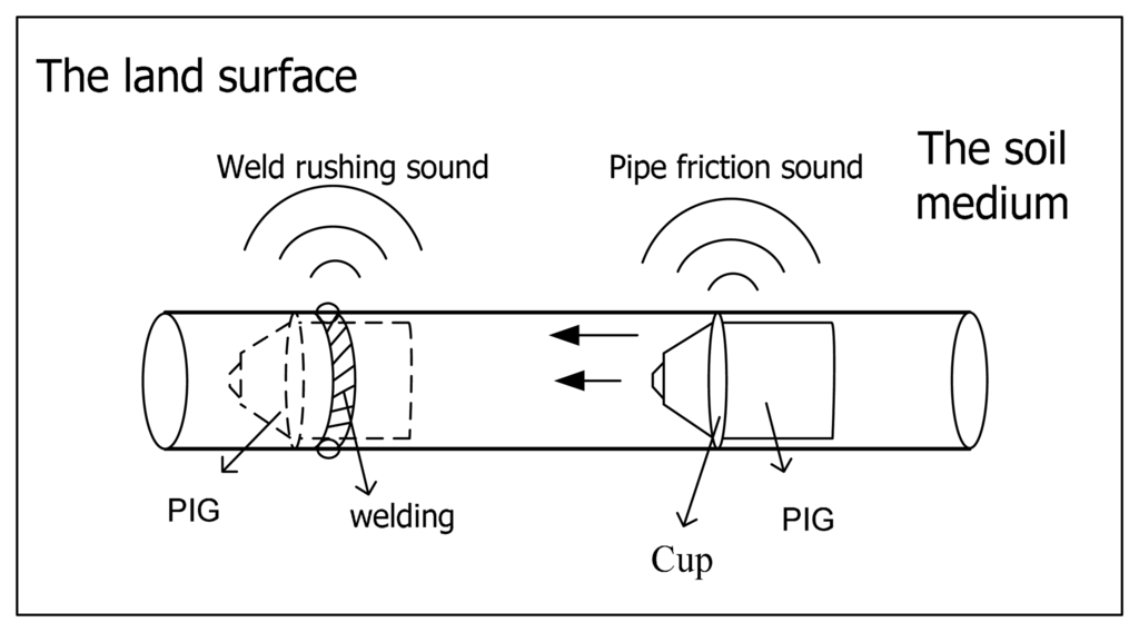In order to verify the orientation of the MEMS acoustic vector sensor, experiments were conducted in soil. The experimental site is located on flat, open land in Taiyuan, Shanxi Province, China, where the soil properties are as follows: porosity, 35%–40%; specific gravity, (2.6–2.7) × 103 kg/m3; bulk density, 1.2–1.3; moisture content, 48%–55%. The positioning principle of the PIG based on the MEMS acoustic vector sensor is shown in Figure 8.