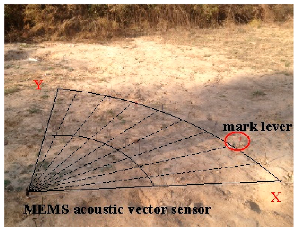 During the experiment, taking the sound sensor as the center and r as the radius, we can get a semicircle, and dividing it on average by 10° as bisecting angle, each point represents a degree. The MEMS acoustic vector sensor has been buried in soil the as shown in Figure 11, with the X-direction coinciding with 0° and the Y-direction coinciding with 90°.
