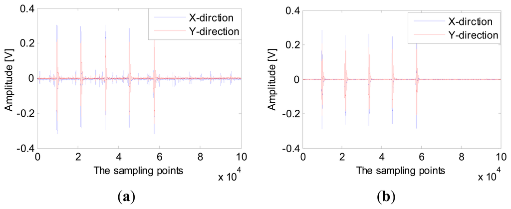 Knocking the ground in the equal diversion point, the sensor will translate the collected sound signal into an electrical signal. The electrical signals are collected by the data acquisition card and processed in MATLAB. The data acquisition card is a PXTe-1071 from NI, and the terminal box is a BNC2110. The experimental sampling rate is 10 K, and the signal collection time is 10 s. Knocking equal diversion points at 40° (r = 5m), the signal collected by sensor is shown in Figure 12a. The signal processed by the wavelet denoising method is shown in Figure 12b.