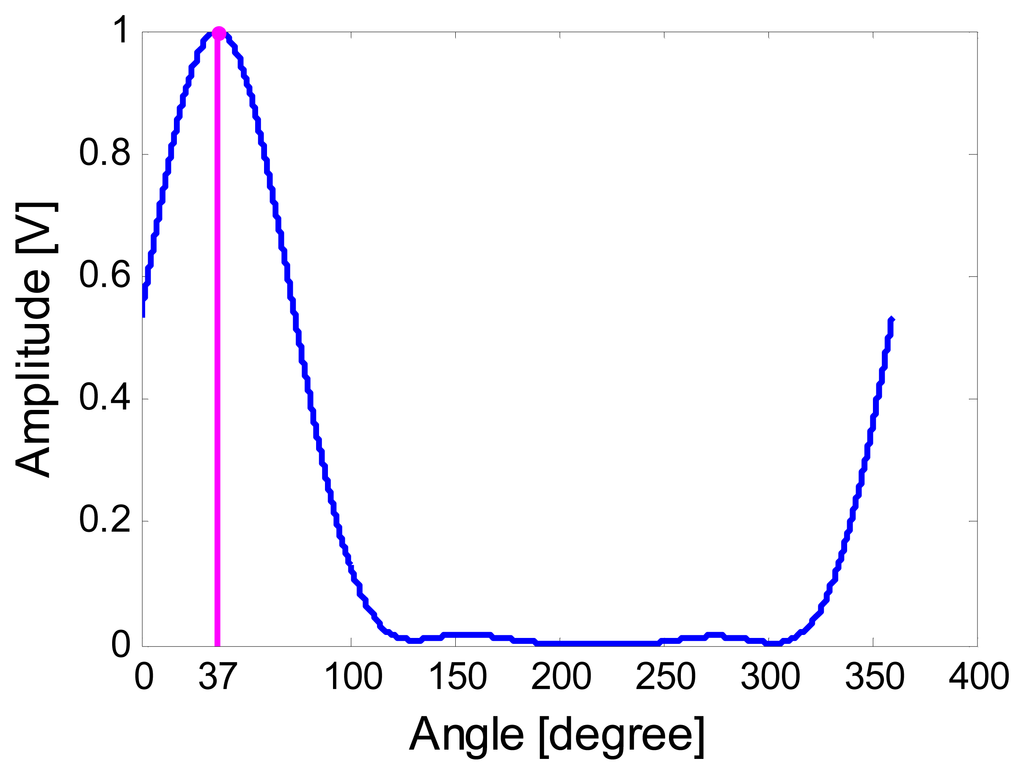 DOA estimation is one of the most critical steps in sound signal processing. For a single vector sensor, the beam-forming algorithm (as described above) is chosen in this paper. The DOA estimation result of the sound source was obtained by the beam-forming method when the actual azimuth angle is 40°. The experimental result is shown in Figure 13.
