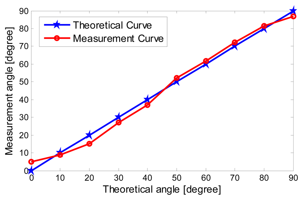 The experiment result in Figure 13 shows that when the actual azimuth angle of the sound source is 40°, the experimental result is 37° so the error is 3°. Further, in the range of 0°∼90°, r = 5 m, we knock five times on each point. Processing the experimental results, taking the average gives the estimation results shown in Table 1 The correlation curves of the measurement angle and theoretical angle are shown in Figure 14.