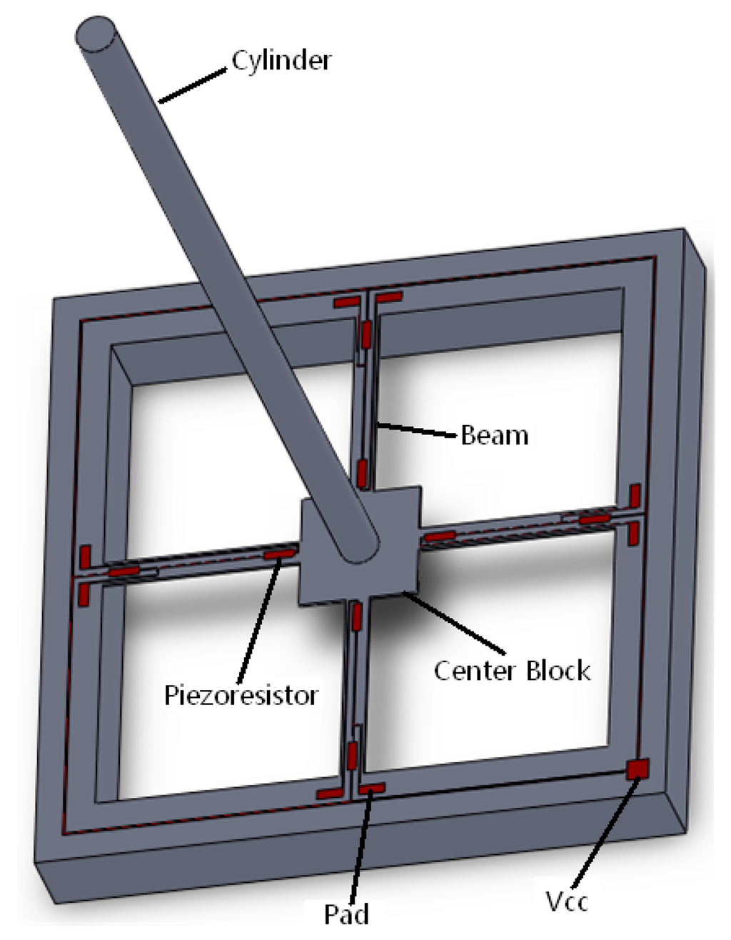 The microstructure of a MEMS acoustic vector sensor is based on silicon and composed of a four-arm silicon microstructure made by a standard piezoresistive silicon micromachining process and a rigid cylindrical body fixed in the center of the beam. The four-arm silicon microstructure can be seen as four cantilevers. A structure model is shown in Figure 3.