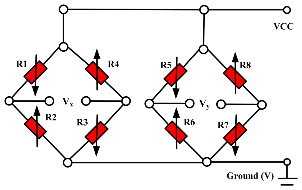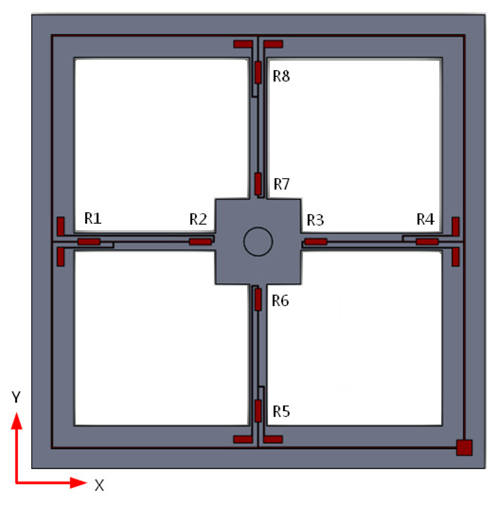 There are eight equal-value strain varistors, R1, R2, R3, R4, R5, R6, R7 and R8, made by means of diffusion in the four-arm system. R1, R2, R3 and R4 constitute a Wheatstone bridge, and R5, R6, R7 and R8 constitute another. The distribution of piezoresistors on the micro-structure is shown in Figure 4 and the Wheatstone bridge is shown in Figure 5. When an arbitrary signal acts on the sensor, it can be decomposed into X-direction and Y-direction components, deforming the cantilevers and the Wheatstone bridges are changed. According to the outputs (Vx and Vy) of the Wheatstone bridge changes, we can determine the direction of the signal source.