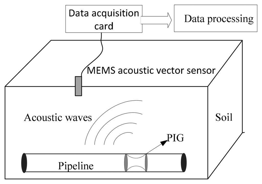 When the PIG runs in the pipe, sound signals will be transmitted all around by the soil medium. Soundwave energy attenuates exponentially with distance when soundwaves propagate into the soil. The higher the frequency of the sound wave is, the greater the attenuation is [12,13]. Due to the soil attenuation effect, the signal will be very weak. The selection of appropriate sensors to collect these weak acoustic signals due to soil attenuation is becoming the biggest problem of AGM.