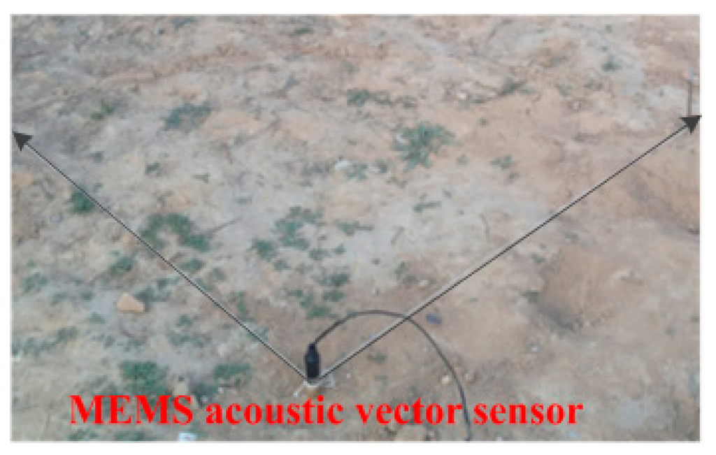 In the experiment, the sensor is vertically downward, and two thirds of the sensor (including sensing head) is buried tightly and heavily in the soil (as shown in Figure 9), ensuring that the sensor is well coupled with the soil. We use a steel hammer knocking on the ground to stimulate the sound source.