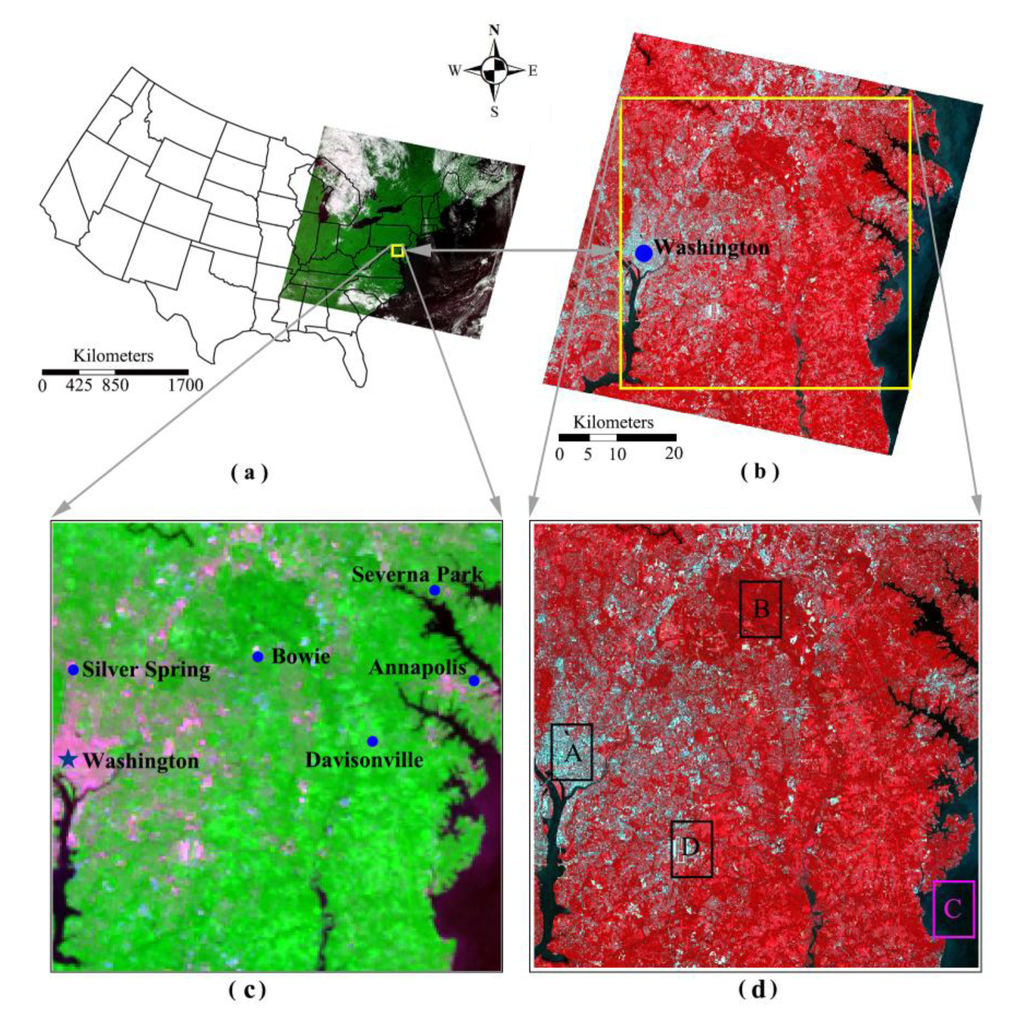 For the application site of Washington (Figure 1), the MODIS LST product (MOD11A1), MODIS emissivity product (MOD11A1, MOD11B1), ASTER LST product (AST_08), ASTER emissivity product (AST_05) and ASTER multi-spectral data (AST_L1B) are collected. A pair of MODIS and ASTER images were obtained for this experiment. The images were acquired at 16:03 Greenwich time (12:03 US east time) on 24 August 2003. The MODIS image covers the eastern region of USA (Figure 1a), while the ASTER image only occupies a small part of the MODIS image due to its very high spatial resolution. Figure 1b shows the ASTER image. After geometric correction, the pixel scale of the MODIS image is 1000 m while the scale of ASTER image is 90 m.