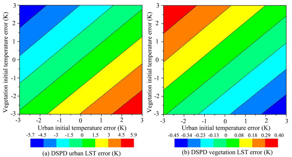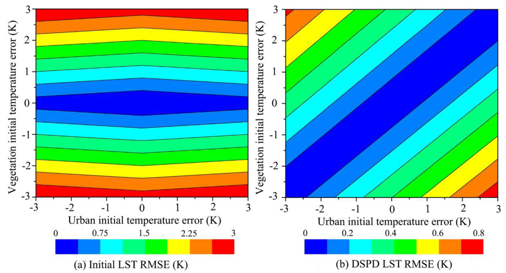 The object of DSPD method is to maintain the thermal radiance to be unchangeable after the decomposition. If the 15 vegetation sub-pixels among total 16 sub-pixels have the same estimated initial temperature error, the thermal radiance conducted by this error will intentionally reflect on the other one urban sub-pixel. As shown in Figure 10, we give the DSPD LST error of urban sub-pixel and vegetation sub-pixels under different initial temperature estimation error. An interesting phenomena will be found, if the vegetation initial temperature error and the urban initial temperature error increase or decrease together, the DSPD LST result of urban and vegetation will both have little error with the green color, because the weight for the sub-pixels change little under this situation. Meanwhile, if the vegetation initial temperature error and the urban initial temperature error increase or decrease inversely, the DSPD LST result of urban and vegetation will have high error with the blue or red color. This means if the 15 vegetation sub-pixels initial temperature are higher estimated and urban sub-pixel initial temperature are lower estimated, the DSPD urban sub-pixel LST will be much lower than its true LST (the blue region of Figure 10a) while the DSPD vegetation sub-pixel LST will be little higher than its true LST (the red region of Figure 10b). Under the maximum situation, the vegetation sub-pixels initial temperature have 3 K higher estimation and the urban sub-pixel initial temperature has 3 K higher estimation, the DSPD urban sub-pixel LST will be 5.7 K lower than its true LST while the DSPD vegetation sub-pixels LST will only be 0.4 K higher than its true LST. And if the 15 vegetation sub-pixels initial temperature are lower estimated and urban sub-pixel initial temperature are higher estimated, the DSPD urban sub-pixel LST will be much higher than its true LST (the red region of Figure 10a) while the DSPD vegetation sub-pixel LST will be little lower than its true LST (the blue region of Figure 10b). Although the DSPD may obtain a large error under the maximum situation in the urban sub-pixel, the error RMSE of total 16 sub-pixels with DSPD is 0.8 K much less than the RMSE of initial temperature RMSE of 3 K (Figure 11), so the error RMSE of DSPD is totally better than the initial temperature.
