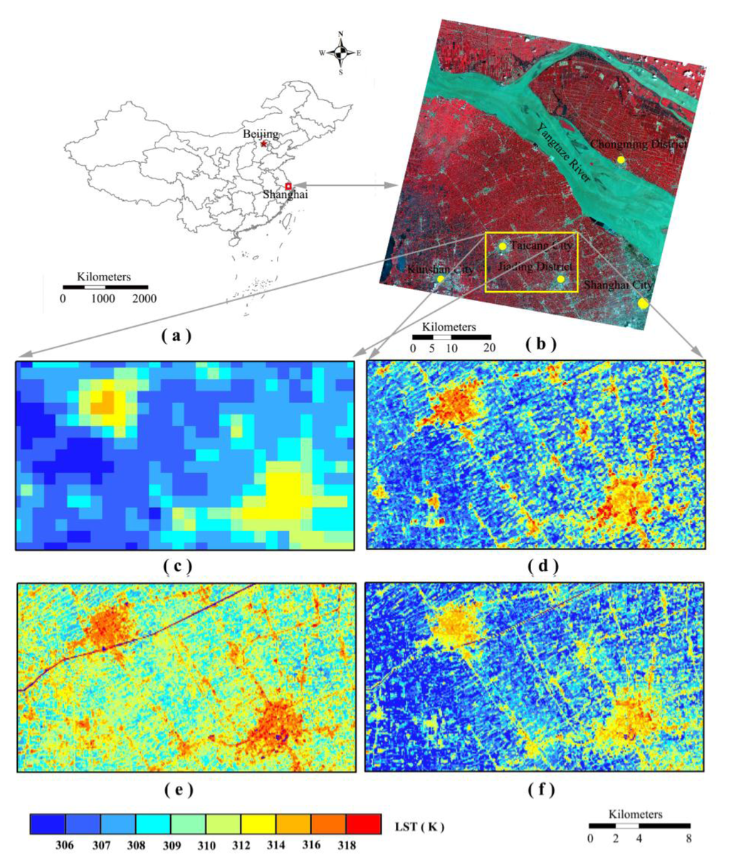 We applied the procedures of our DSDP approach to another site of Shanghai in east of China (Figure 12a). With rapid development of economy, urbanization is very obvious in the region, especially Shanghai City, the LST product with high spatial resolution is the essential data for urbanization study. As shown in Figure 12. The ASTER and MODIS LST in Shanghai area were acquired at 02:47:07 Greenwich time (10:47:7 local time) on 1 August 2000. Figure 12c shows the subset of the MODIS LST image and Figure 12d is the subset of the ASTER LST image covers Shanghai region, the Taicang city and Jiading district. The decomposed results of E_DisTrad (Figure 12e) and our DSPD (Figure 12f) all could reflect the spatial distribution of high LST in the urban building area and low LST in the vegetation and water area. The decomposed LST result of E_DisTrad has an apparently high estimation compared with the ASTER LST data. The LST in vegetation area with about 306 K is highly estimated to 310 K, and the hot points in the urban area are much more. This high estimation result has been effectively decreased after our DSPD method. The decomposed LST result of DSPD in the vegetation area is lower than the E_DisTrad result and much similar with the observed ASTER LST. We would find the decomposed LST result of DSPD in the urban area of Taicang city and Jiading district is about 2 K lower than ASTER LST. This is mainly attributed to the discrepancy between the ASTER and MODIS LST product in this area [45]. Therefore our DSPD method provides an alternative approach to improve the spatial resolution of thermal remote sensing system such as MODIS with coarse pixel scale.