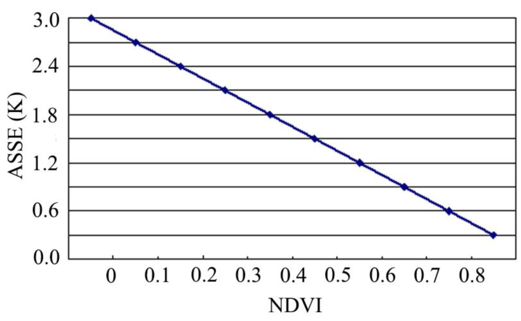 In order to conduct the validation, a series of procedures have to be conducted for computation of LST error statistics indices in Equations (24)–(26). As shown in the Figure 5, the decomposition process has some difference with the MODIS decomposition with its VNIR. The difference is mainly focus on the thermal radiance calculation with ASTER and MODIS. Because the wavelength range of the MODIS and ASTER thermal bands are different, and the effective emissivity varies with different wavelength range. The radiance cannot be compared directly between MODIS and ASTER. So the broadband emissivity (BBE) is used to calculate the thermal radiance of MODIS and ASTER in wavelength range 8–13.5 μm. Ogwa et al., showed that surface broadband emissivity could be estimated as a linear combination of the narrowband emissivity estimates in the range of 8–13.5 μm [33,44]. And Cheng et al., give the broadband emissivity estimation method of ASTER and MODIS with their narrow thermal band emissivity [31]: