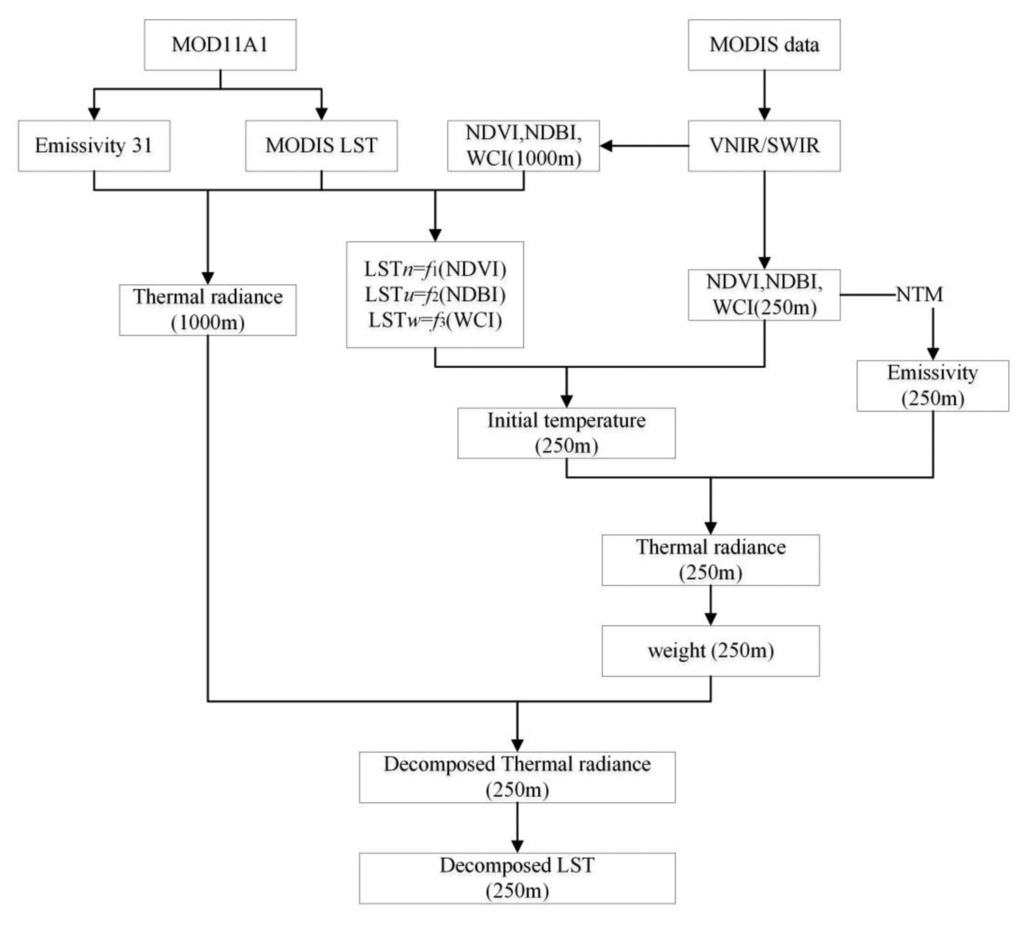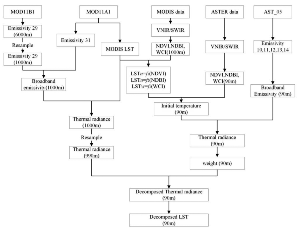 Then procedures to conduct MODIS LST pixel (1000 m) decomposition into ASTER LST (90 m) with the approach can be summarized as follows: