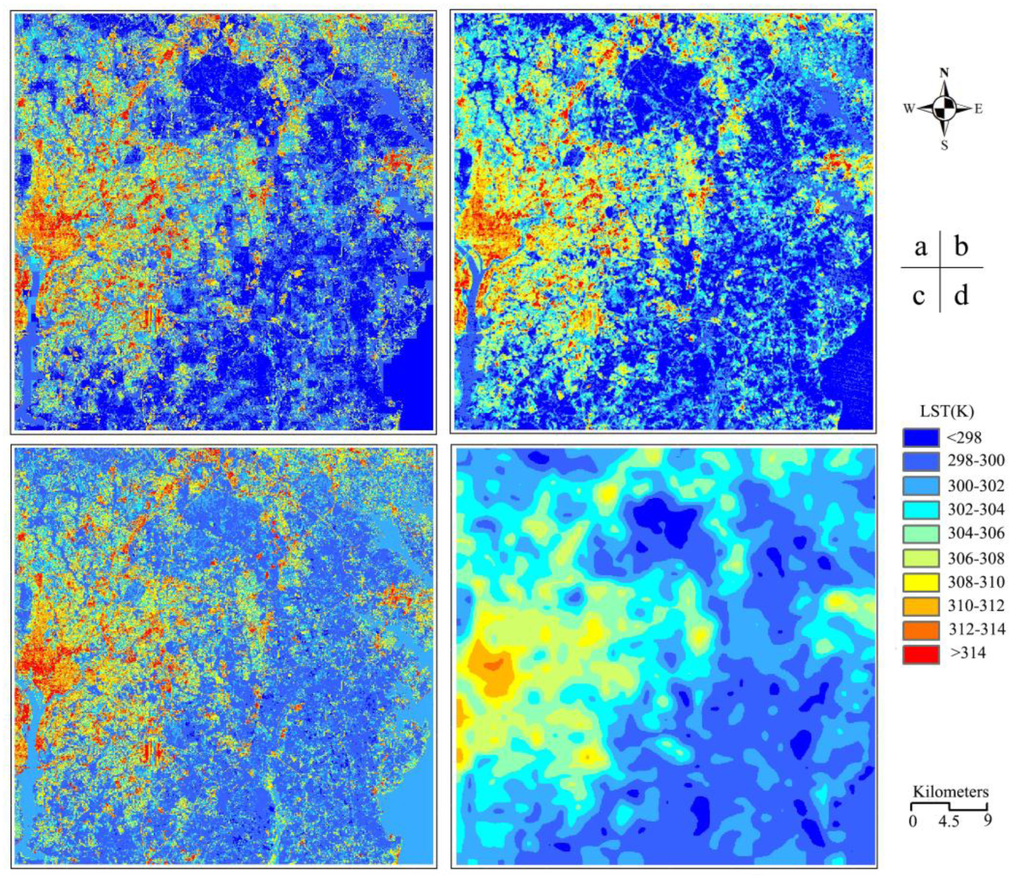 Using the procedure shown in Figure 5, we are able to decompose the entire MODIS LST image into the pixel scale of 90 m. Figure 7a shows the decomposed result of the MODIS LST image. The accuracy of the decomposed LST (Figure 7a) can be assessed through comparison with the simultaneous measurement of LST (Figure 7b) obtain from the ASTER LST product. Very similar distribution of the LST can be seen in the two images (Figure 7a,b), demonstrating that the decomposed LST from the coarse spatial resolution of MODIS LST image is applicable.