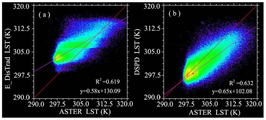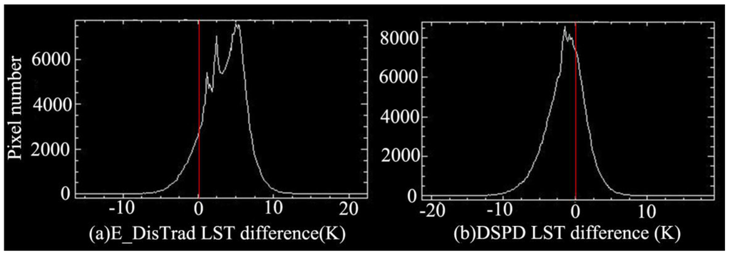 We respectively made the scatter plot by the result of E_DisTrad and DSPD method with the ASTER LST respectively, the regression line of DSPD is much closer to the red 1:1 reference line with the slop of DSPD regression line (Figure 8b) is 0.65 better than that of E_DisTrad method 0.58 (Figure 8a). The difference statistic chart of the decomposed LST and ASTER LST (Figure 9b) also indicated a satisfactory estimation with our DSPD method than E_DisTrad method.