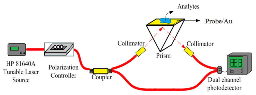 In the current study, the analyte and its corresponding binding reaction with the receptor could be instantly detected using this method. A SPR sensor for MTB DNA was developed based on the stable and repeatable tunable laser wavelength modulation of optical fiber communications. Here, the immobilization with 5′-thiol end labeled DNA probes was applied to enhance the SPR sensitivity and resolution compared with sensing without probes.