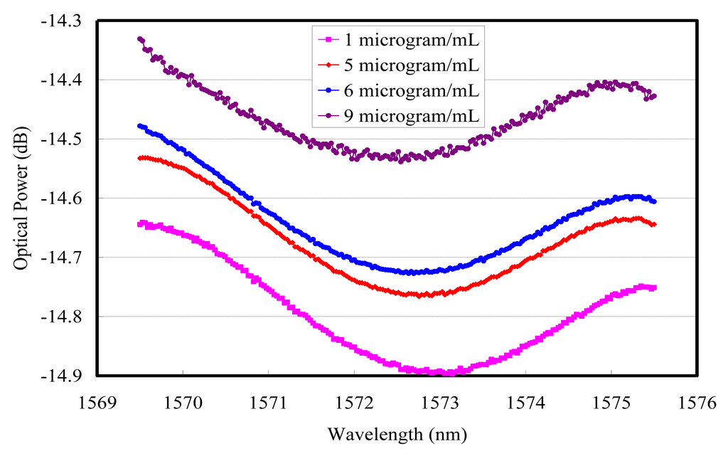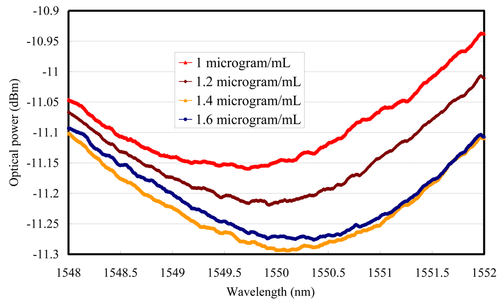As for the correlation between the resonant wavelength and reflected resonant optical power in non-immobilization conditions, the resonance wavelength measured −0.0764 nm/(μg/mL) and 0.01 μg/mL, respectively, for sensitivity and resolution when the wavelength accuracy of the HP 81640A tunable laser source was 0.001 nm. In Figure 2, the reflected resonant optical power gave −0.046 dB/(μg/mL) as sensitivity and the resolution was 0.217 μg/mL, similar to the values of a previous publication [6], when 0.01 dB accuracy of the optical power meter was achievable. The sensitivity from the resonance wavelength is 10 times higher than the reflected resonant optical power.