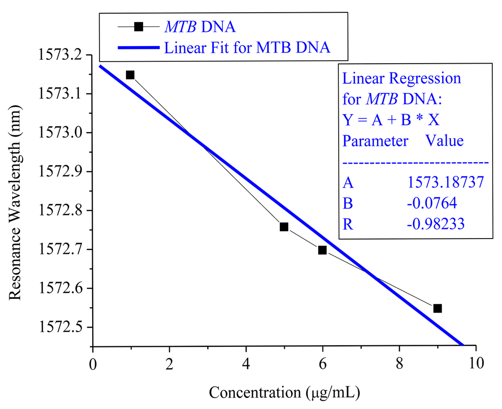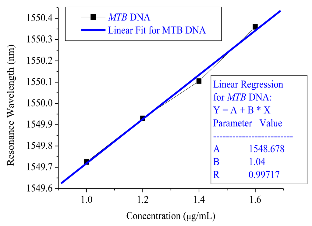 The detected MTB DNA concentrations were categorized as 9, 6, 5 and 1 μg/mL. The wavelength modulation showed that the resonance wavelength difference was 0.603 nm from 9 μg/mL to 1 μg/mL under non-immobilization conditions and 0.635 nm from 1 μg/mL to 1.6 μg/mL under immobilized DNA conditions. The sensitivity from the linear slope without immobilization was −0.0764 nm/(μg/mL) and its linear regression R was 0.98233, as shown in Figure 4. 0.001 nm wavelength accuracy was secured from the HP 81640A TLS and the MTB DNA resolution without probing was 0.01 μg/mL.