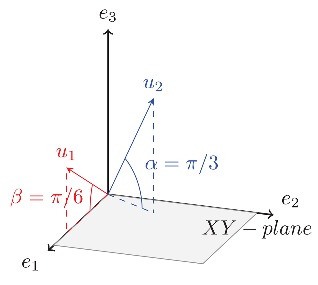 Let vectors e1, e2 and e3 in Figure 1 be the left singular vectors, as defined in Equation (1), obtained after applying SVD to the test set to be identified. Imagine that the threshold η is set to 0.95. Assuming that according to their associated singular value the 95% of the energy is focused on e1 and e2, then these are defined as the K = 2 first left singular vectors that form the basis of the signal subspace, while e3 is discarded; hence, the signal subspace of the test set in this example corresponds to the XY plane. After the application of SVD to the training set, vectors u1 and u2 in Figure 1 are obtained as its left singular vectors as defined in Equation (1). In order to know the level of dependency of these vectors to the test set signal subspace, the angle between them and their projection onto it is obtained. Notice that u1 is closer to the XY plane than u2, in this example the angle found for u1 is β = π/6 while the angle found for u2 is α = π/3; the smaller the angle, the closer to the subspace.