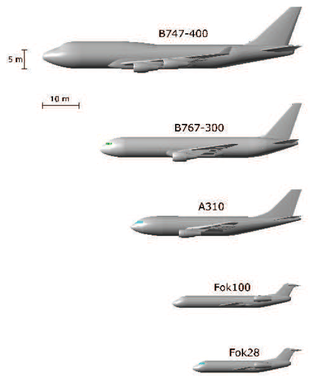 The test set includes measurements of 5 civil in-flight aircraft in different flighpaths, the Boeing 747-400, the Airbus A310, the Boeing B767-300, the Fokker 28 and the Fokker 100, a large, two medium and two small-sized aircraft. These data were collected with the FELSTAR S-Band radar at TNO-FEL located in The Netherlands. During acquisition, information from a secondary radar was available providing the target type and an estimate of its flightplan. The error on the estimated aspect angle of the aircraft does not exceed 5 degrees in both azimuth and elevation. Rapid changes in elevation, or if the aircraft was making a long turn in its trajectory, would affect the profiles, nevertheless, in the measurement campaign, only targets under conditions of no long turns nor approaching or leaving an airport runway were measured. Moreover, the measured profiles are free of influences of radial velocity since the FELSTAR radar used a velocity tolerant waveform (the times at which the pulses are transmitted are chosen such that the resulting range profiles are focused irrespective of the velocity). Since the generalization capability is sought, for the creation of the training set the CAD models of the same 5 aircraft have been developed at INTA (Spanish National Institute for Aerospace Technology) and the profiles have been predicted by FASCRO using the information of the estimated aspect angles given in the test set. Figure 2 shows the CAD models used to obtain the simulated profiles.
