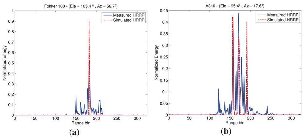 Traditionally, target recognition algorithms are validated via comparison of a test set of actual HRRPs with a database of potential targets previously collected via cooperative measurements [3,26]; on the contrary, there are some authors that validate their algorithms via comparison of a test set of predicted HRRPs with a database of profiles predicted also via electromagnetic simulations [8,27]. The principal disadvantage in proving the accuracy of the algorithms lies in the fact that comparison is done in the same domain, that is, actual measurements vs. actual measurements or simulated profiles vs. simulated profiles. In both cases, the test and training samples have similar nature and usually a similar high signal-to-noise ratio (SNR) resulting in good recognition results.