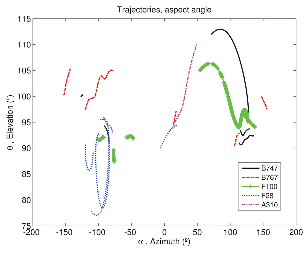Figure 4 shows the aspect angles of the trajectories used in the process, where nose-on aspect angles corresponds approximately to (θ = 90°, α = 0°). Note that since the method pretends to be validated for any aspect angle, this study is not only focused on trajectories in nose-on, any trajectory is valid.