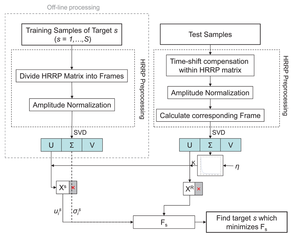 As noted, the preprocessing and SVD of the training samples is done off-line, which means a reduction in the computational burden since the singular values and vectors of the potential targets will be already loaded in the database. Taking into account the singular values of the test samples and setting an energy threshold η as in Equation (4), the signal subspaces of both sets are defined as the K most significant ui singular vectors (XS and XR in the figure), and the noise subspaces are discarded resulting in a dimensionality reduction. Finally, using the defined signal subspaces the algorithm will identify the test sample as the target s that minimizes the chosen metrics (F1s or F2s).