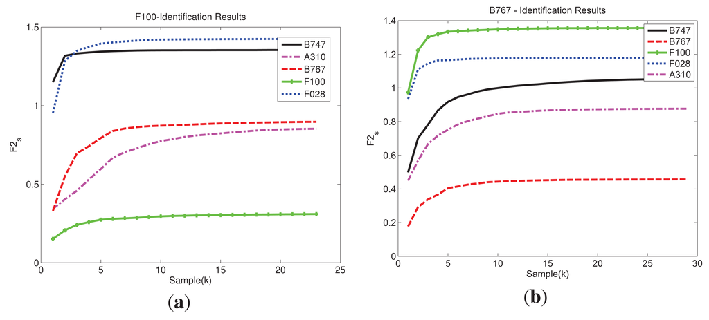 In Equation (6) are the K first singular values associated to each synthetic aircraft in the training set and, as in Equation (5), is the angle between the test set signal subspace and each singular vector of the training set. Finally, the algorithm decides the test sample belongs to the target that minimizes the cost function (6). In the previous example, in contrast to F1s the application of Equation (6) would result in the identification of aircraft A since: