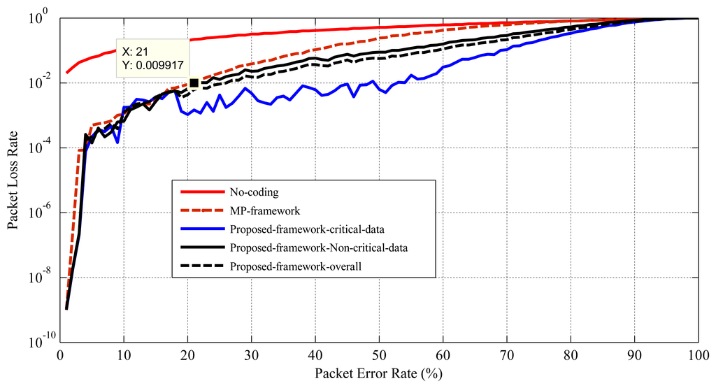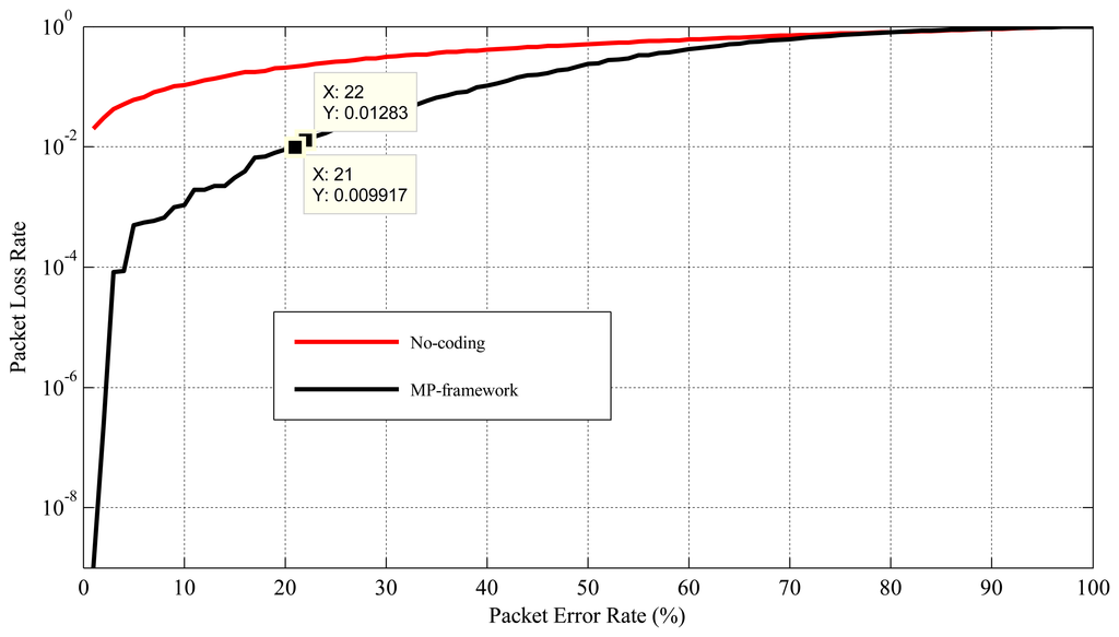 For critical health monitoring applications, it is necessary to receive the critical data (high priority data) with a PLR < 1% [,]. However, MP's approach has failed to provide health monitoring applications with this requirement when the channel is suffering from a PER higher than 20% (as shown in Figure 6). This is because MP's error recovery mechanism is not adaptive to the network conditions, and it does not take necessary actions on transferring the high priority or critical data when the channel is suffering from a high rate of packet errors. In order to solve this problem, the proposed mechanism allows users or doctors to identify the critical sensors for the system or application. Every time a sensor sends its data to a relay node, the relay node checks its priority label (e.g., critical or non-critical). Then, considering the current PER from which the channel is suffering, it provides the destination with enough encoded packets for high priority data. This is to make sure that the destination receives the high priority data with a PLR under 1%. To add extra packets, the network is designed in such way that every relay node is responsible for making extra encoded packets for three sensors. For the considered network scenario, the allocations are: R1: S1, S2, S3, R2: S4, S5, S6, R3 : S7, S8, S9 and R4 : S10, S11, S12. Similar to MP's mechanism, in this work, every relay node collects data from six sensors (see Figure 3), but responsible for making “extra” encoded packets only for three sensors.