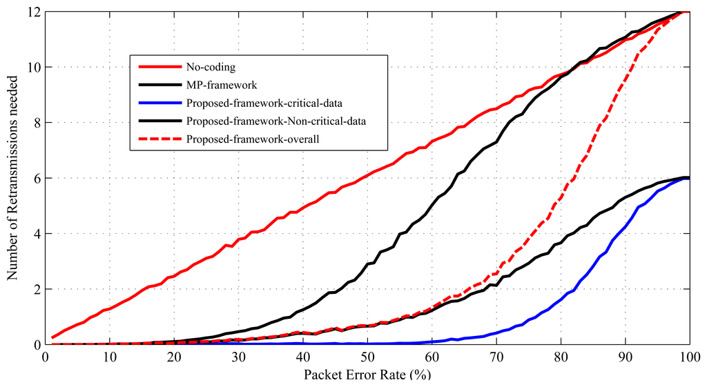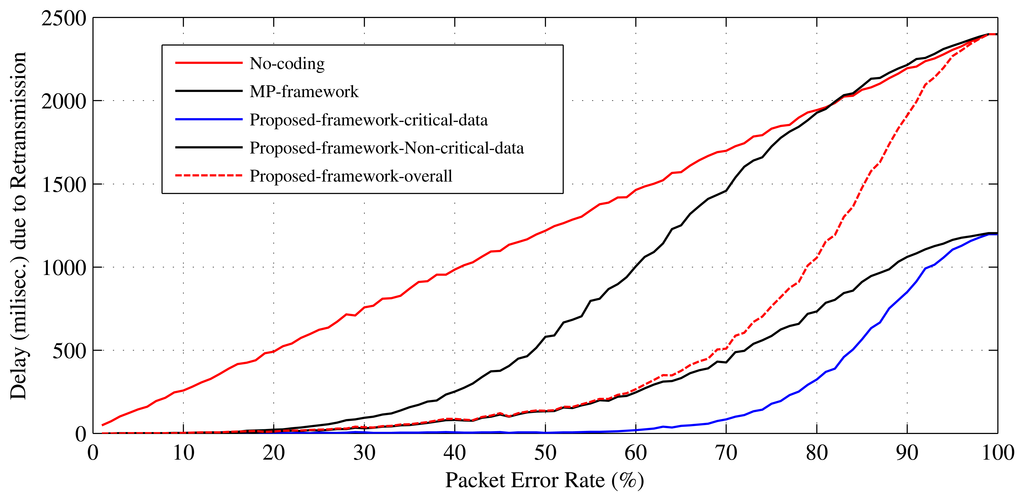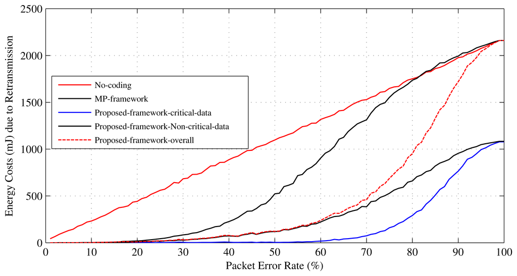 A high level of reliability, especially in the case of high PER, can make the proposed mechanism a reliable one during the security attacks. Though PLR is a QoS issue, it has the potential to pose a serious security threat in WBSNs. In WBSNs environment [], attackers can harm the system by simply presenting a low level of noise to the channel and causing a lot of packet losses. They even can block the whole system by causing infinite retransmissions. The interesting point in the reliability performance of this mechanism is that this mechanism generates extra encoded packets only in order to support the high priority data, but still, the non-critical data experience a better PLR. This is because of the XoR (⊕) coding schema that makes relation between different types of packets. For example, consider the scenario where S1 is labeled as the critical sensor and S6 is labeled as non-critical. Furthermore, consider that the channel is suffering from high values of PER and that both the S1 and S6 data are lost during the transmissions. However, as this mechanism provides the destination with few extra encoded packets related to S1's data, the destination can recover the S1 data (P1;. Moreover, Relay 1 always sends an XoRed packet that includes the data of S1 and S6 (P1⊕P6). Thus, when the personal server (destination) receives the P1 ⊕ P6, by having P1, it can recover the P6, too, as P6 = P1 ⊕ (P6 ⊕ P1).