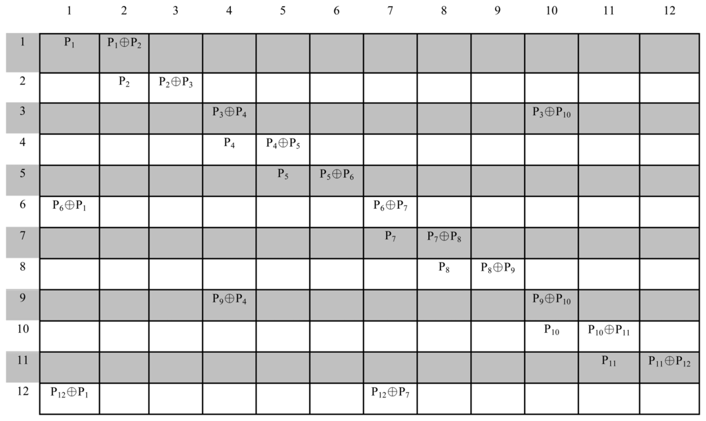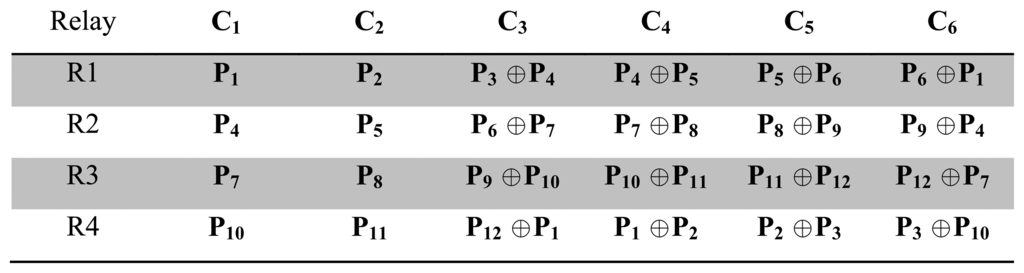 In MP's NC-based error recovery mechanism, body sensors send their packets to the relay nodes, and the relay nodes XOR the received packets, then transmit them to the destination (PS). The network is designed in such way that each body sensor sends its data through two relay nodes and every relay node collects the data from six sensors (for the considered scenario). Sensor allocations are shown in Figure 3. The idea behind this approach is that every relay node sends two uncoded packets, and four packets coded using the XoR operation instead of sending six uncoded packets, as shown in Figure 4. With this approach, redundancies are available in the received packet, as seen (Figure 5) in the received matrix at the destination. The N × N received matrix in Figure 5 shows the available redundancy for every packet received from sensors, where Pm represents the data packet from the sensor node Sm, m = 1, 2, …, 12 and cell Pm×m is the uncoded and Pm×n the encoded packet, where n = 1, 2, …, 12. These redundancies ultimately help this approach to recover packets in the case of high PLR and improves the reliability. For instance (as shown in Figure 5), if packet P1 is lost, still, it can be recovered, as the destination might have received one or two encoded packets (P12 ⊕ P1 and P1 ⊕ P2), which contain P1.
