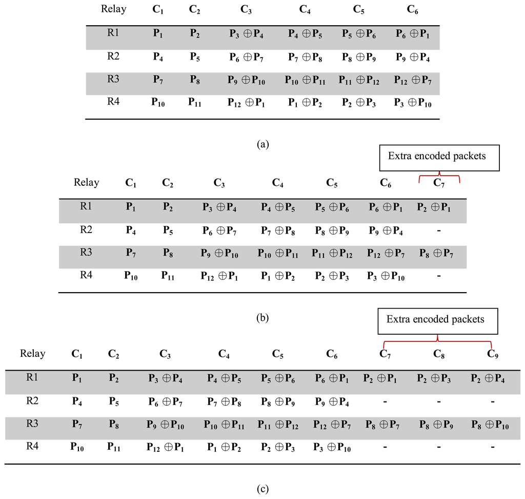 The work in [] is the non-NC based error recovery mechanism that covers the widest range of QoS requirements compared to others. However, it is not adaptive to the network's channel conditions. Moreover, [] applies a clustering mechanism, and it is very difficult to make a clustering algorithm adaptive to the network's dynamic channel condition. On the other hand, NC-based error recovery mechanisms [,,–] have great potential to be efficiently adaptive to the network channel conditions. Considering the security issue, this work will consider XoR-based NC for WBSNs. However, XoR-based existing works [,] could suffer in security and privacy, too, as they need to decode all or most of the packets at relay nodes. Therefore, Marinkovic and Popovici's (MP's) XoR coding-based approach [] is selected as the base work in this work. This work will extend this NC-based mechanism in order to make it adaptive to the network's channel conditions and user QoS requirements. Adaptiveness to network channel condition and users' requirements will help the mechanism to improve the performance in terms of reliability, energy efficiency and real-time delivery. As the proposed work is based on MP's work, in the following, first, we briefly present MP's mechanism (for details, please see []) and then present the proposed one.