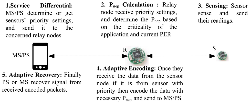 One way to make an error recovery mechanism adaptive to the network channel conditions is to make the number of extra encoded packets adaptive based on the current packet error rate (PER) [,]. If the channel suffers from a high PER, the error control mechanism can provide the destination with extra encoded packets in order to increase the chance of packet recovery at the destination. This work relies on this method to make the proposed approach “adaptive to the network's channel conditions”. An error recovery mechanism integrated with service differentiation or sensor priority settings based on applications or user demand can improve the overall QoS support of the mechanism. Hence, the proposed error recovery mechanism along with PER also depends on the sensor's adaptive priority settings by the PS or MS.